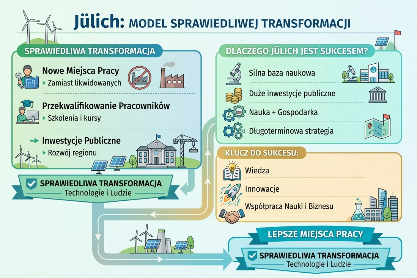 Gmina Jülich w kraju związkowym Nadrenia Północna-Westfalia pokazuje, jak przejść od gospodarki opartej na paliwach kopalnych do centrum nauki, technologii i zielonej energii. To waśnie na naukę postawiono tutaj zamiast węgla. Najważniejszym filarem transformacji jest Forschungszentrum Jülich – jedno z największych centrów badawczych w Europie. W skład centrum wchodzi dziewięć instytutów badawczych, związanych z biologią, fizyką, medycyną, energetyką jądrową i naukami technicznymi. Prowadzone są tam m.in. badania nad energią przyszłości, klimatem czy sztuczną inteligencją, pracuje tu ok. 5 tys. osób. Zatem kopalnie zamieniono na laboratoria. To właśnie w Jülich kilka miesięcy temu uruchomiono superkomputer „Jupiter”, jeden z najnowocześniejszych w Europie, wspierający rozwój AI i transformację klimatyczną. Poza tym w regionie zamiast przemysłu ciężkiego rozwijają się technologie cyfrowe, cyberbezpieczeństwo, centra badawczo-rozwojowe. Władze stawiają także na współpracę nauki z biznesem a to oznacza, że firmy lokują się w tym regionie, bo mają dostęp do wiedzy oraz korzystają z infrastruktury badawczej. Transformacja w tym regionie została wykorzystana do stworzenia „laboratorium przyszłości”. Region reński (w tym Jülich) jest dziś określany jako najbardziej ambitny projekt transformacji klimatycznej w Europie. Opiera się na czterech filarach: energia, cyfryzacja, przemysł przyszłości, ochrona klimatu. Sukces regionu opiera się m.in. na ogromnym wsparciu państwa, które tworzyło tutaj instytuty badawcze. Co ważne Jülich nie próbowało „ratować starego przemysłu”. Zamiast tego zbudowało zupełnie nową specjalizację: nauka + technologie + energia przyszłości. W każdym z przykładów transformacja to oczywiście zmiana źródła energii, ale nie tylko. Przebudowano całą gospodarkę i sposób funkcjonowania regionów.